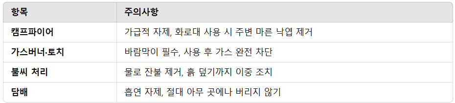 | 🔥 불씨 방치 | 버너, 토치, 캠프파이어 후 잔불 방치 |