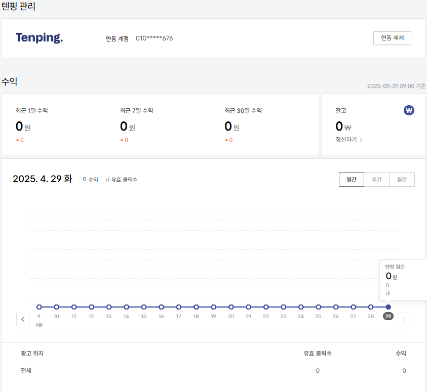 메뉴의 ‘수익" "텐핑 관리’ 탭을 누르면 다음 항목들을 확인할 수 있어요: