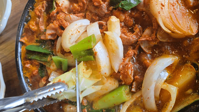 냄비에는 곱창과 야채(대파, 양파)가 듬뿍 담겨져 바로 등장!
