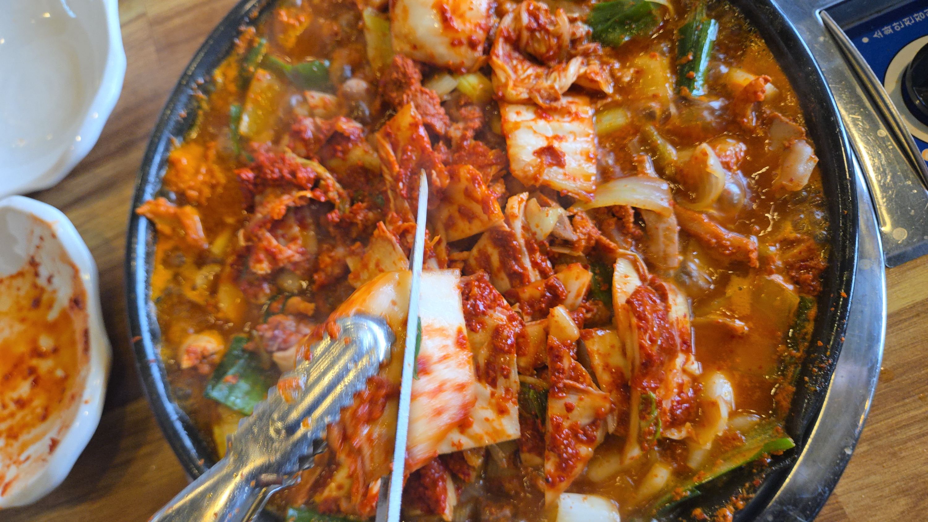 시간이 지나면 곱창, 김치, 야채를 가위로 슥슥 잘라 줍니다.