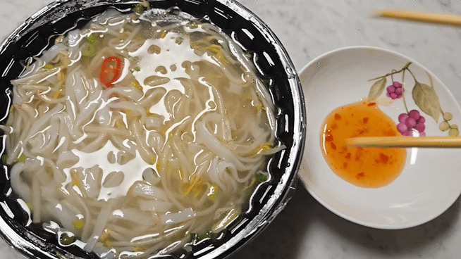 젓가락으로 잘 저어서 따끈한 국물에 쌀국수를 풀어줍니다.