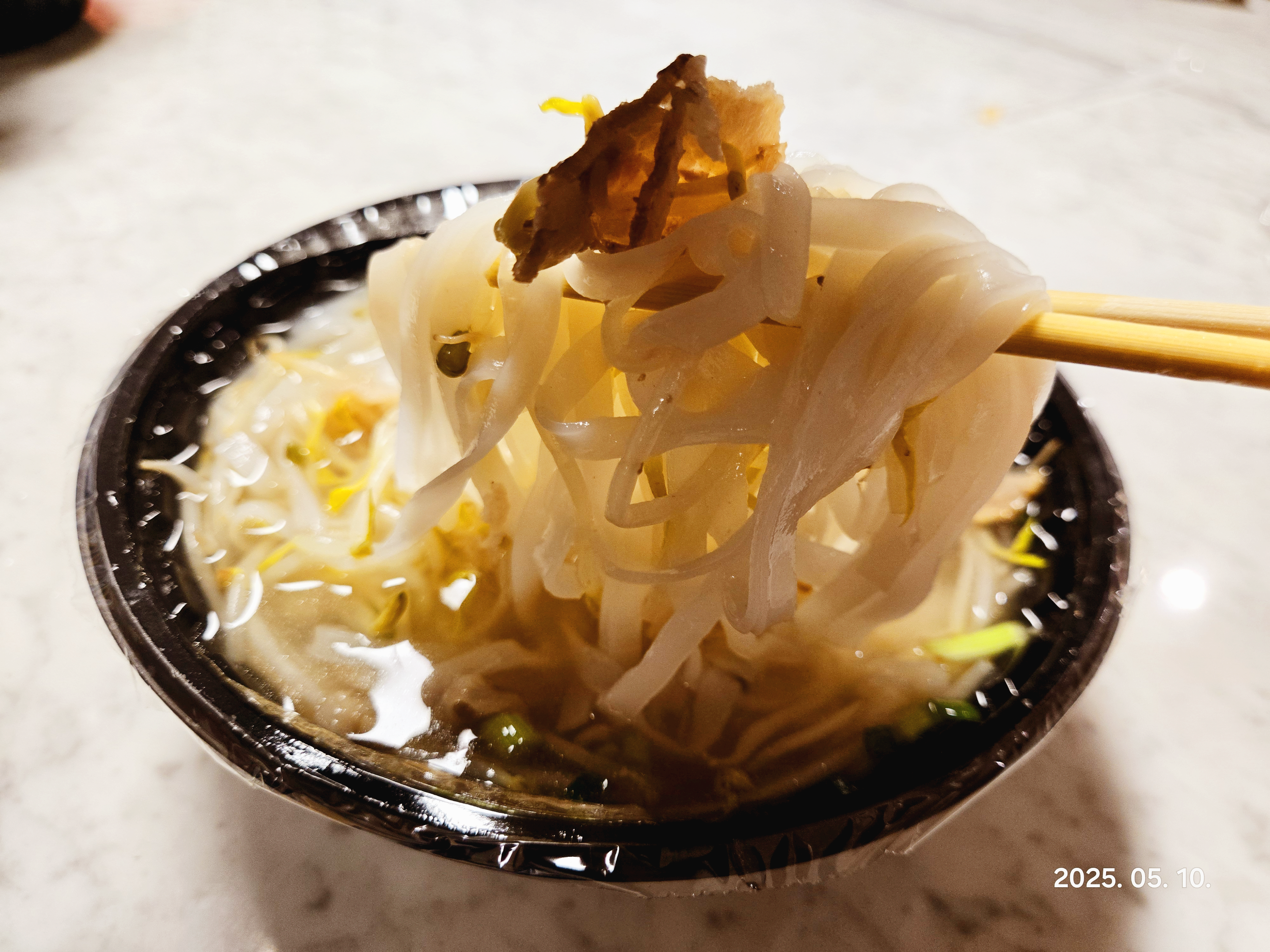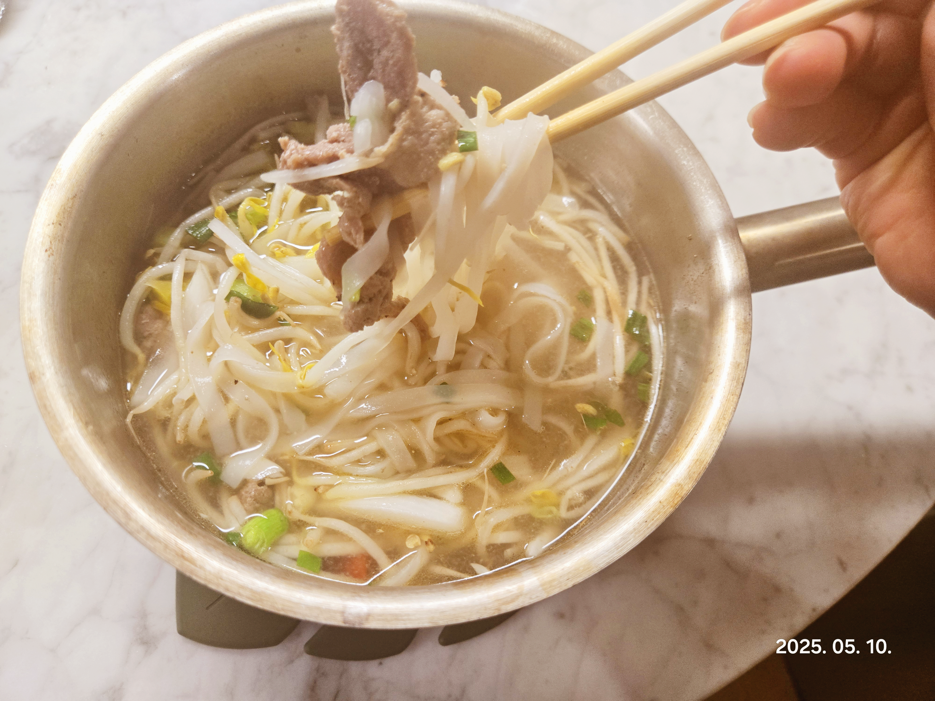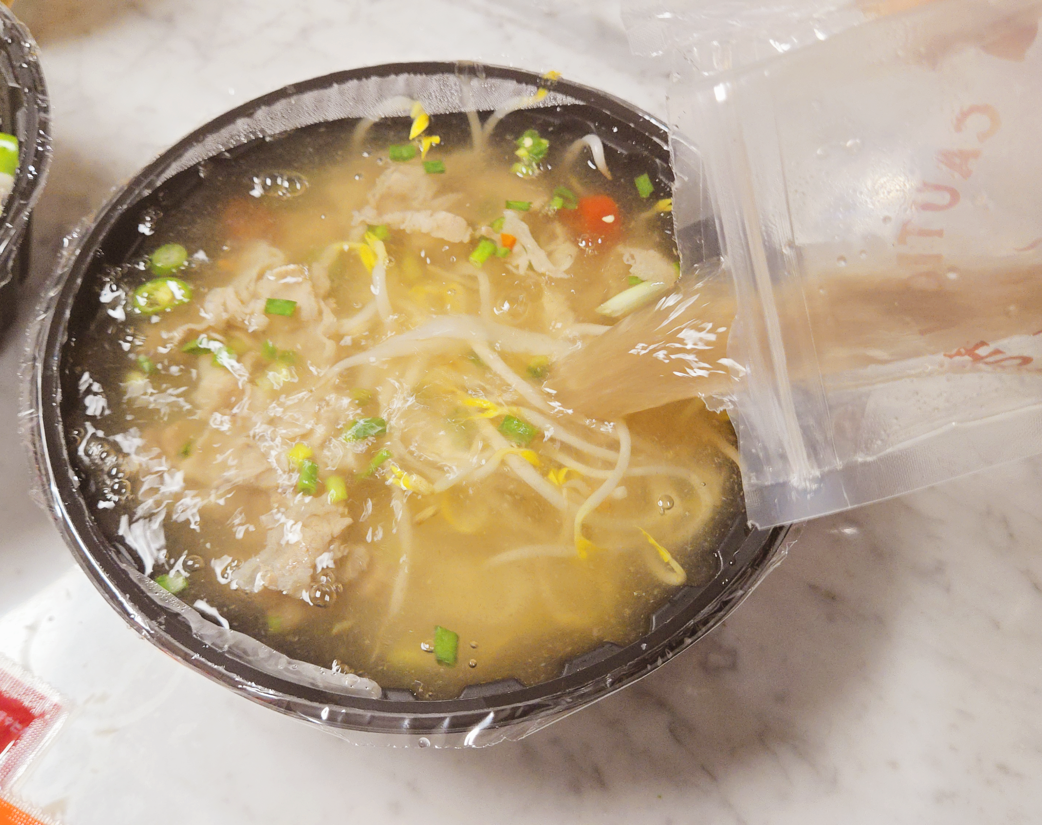 방금 도착한 육수는 아직도 따끈해서 바로 쌀국수에 붇습니다.