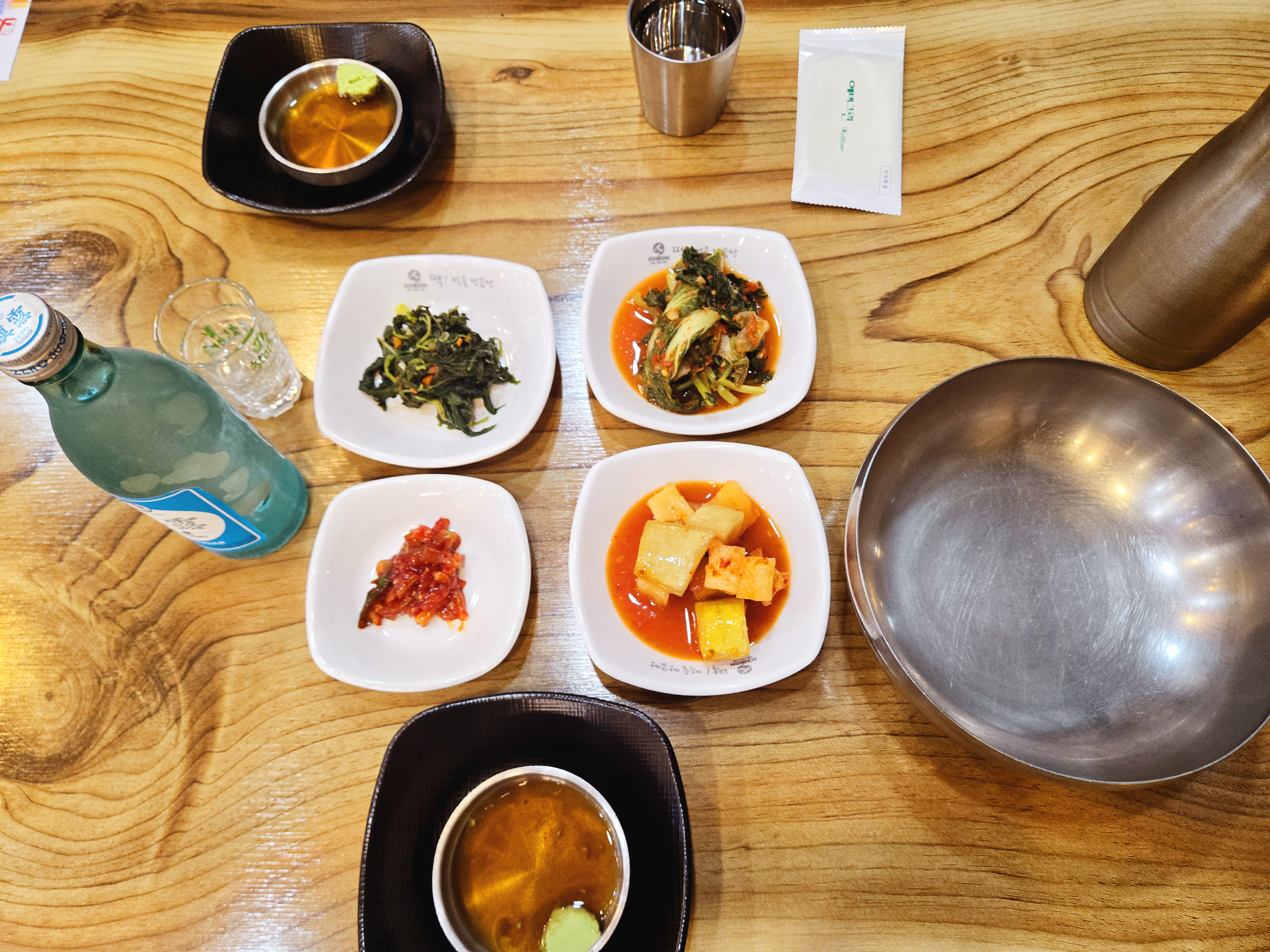 기본 반찬은 총 4가지: 깍두기, 배추김치, 나물, 오징어젓갈. 들쑥날쑥한 구성일 수 있다고 하지만, 이 날의 반찬들은 전체적으로 간이 세지 않고 담백한 스타일이라 국물 요리와 참 잘 어울렸습니다. 손이 가는 반찬이 많았어요.